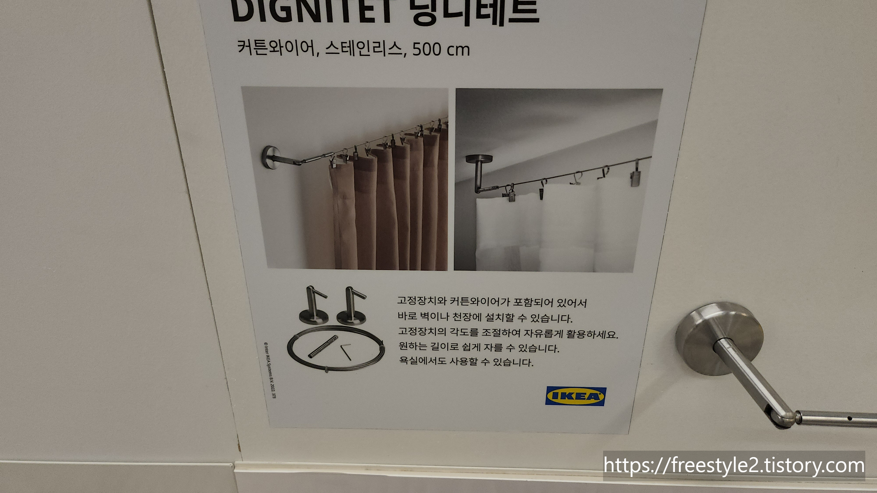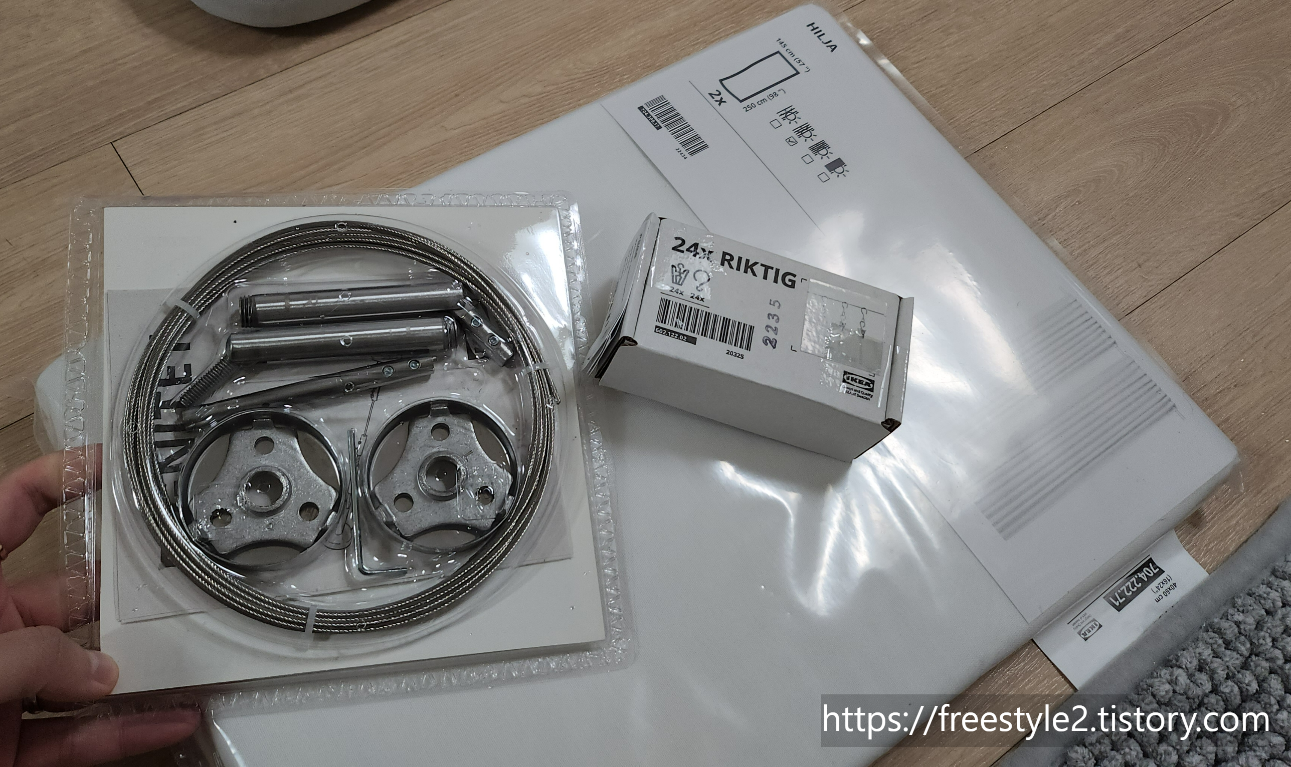 힐리아 커튼 한 쌍, 딩니테트 커튼 와이어, 릭티그 커튼후크+클립 이렇게 3종을 구매해왔어요.