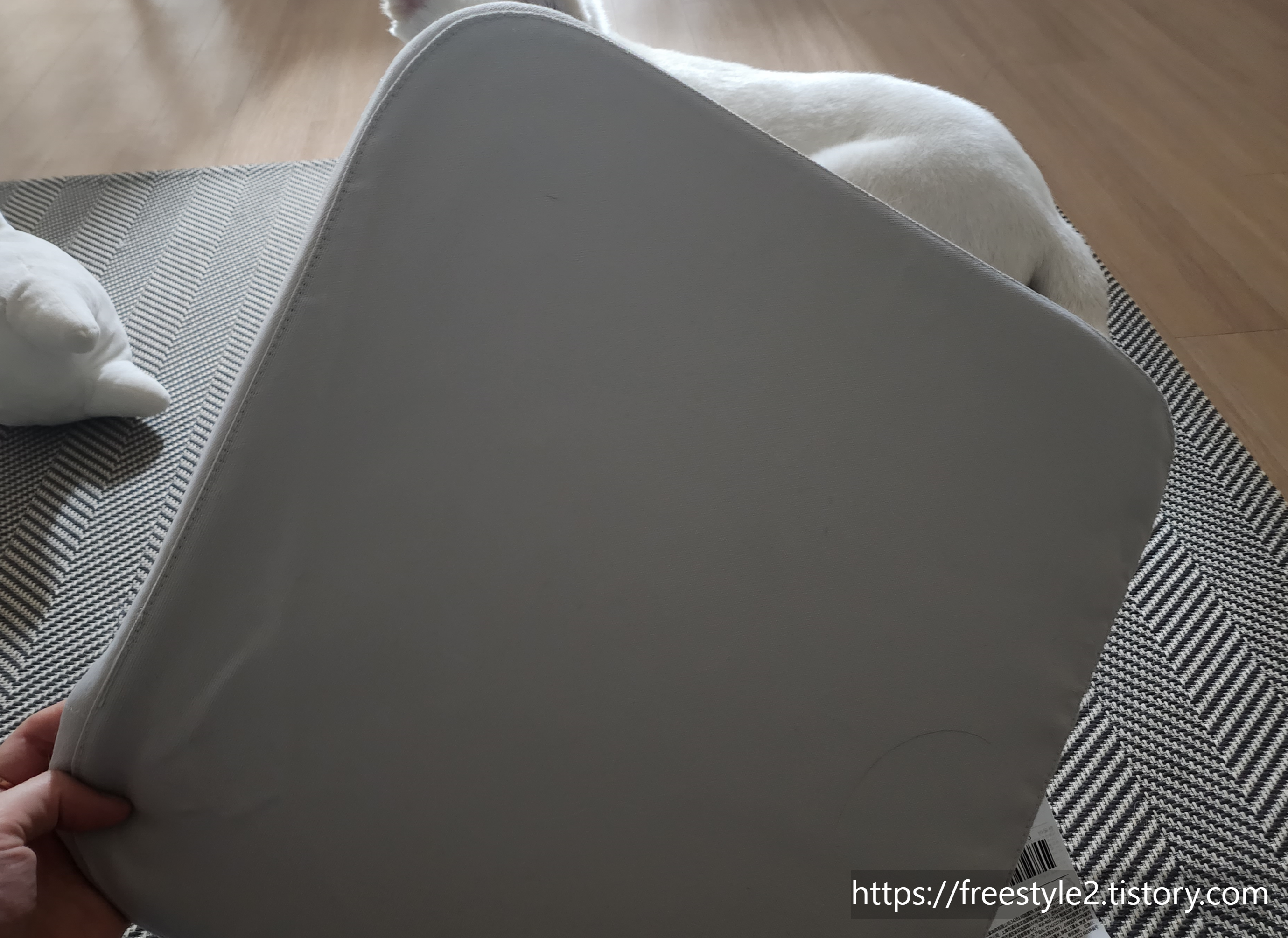 마지막으로 스탁스타르 의자패드입니다.구입한 색상은 라이트그레이 색상이고 이 외에 레드, 멀티컬러, 베이지 그린 컬러, 블랙, 블랙/화이트 컬러가 있어요.크기는 36*36*2.5cm이고 가격은 5,900원입니다.의자 패드 뒷면에 미끄럼방지 처리가 되어 있어서 쉽게 밀리지 않게 되어 있고 지퍼식 커버로 되어있어요.쿠션감은 생각보다 괜찮더라구요! 무난무난한 제품입니다.